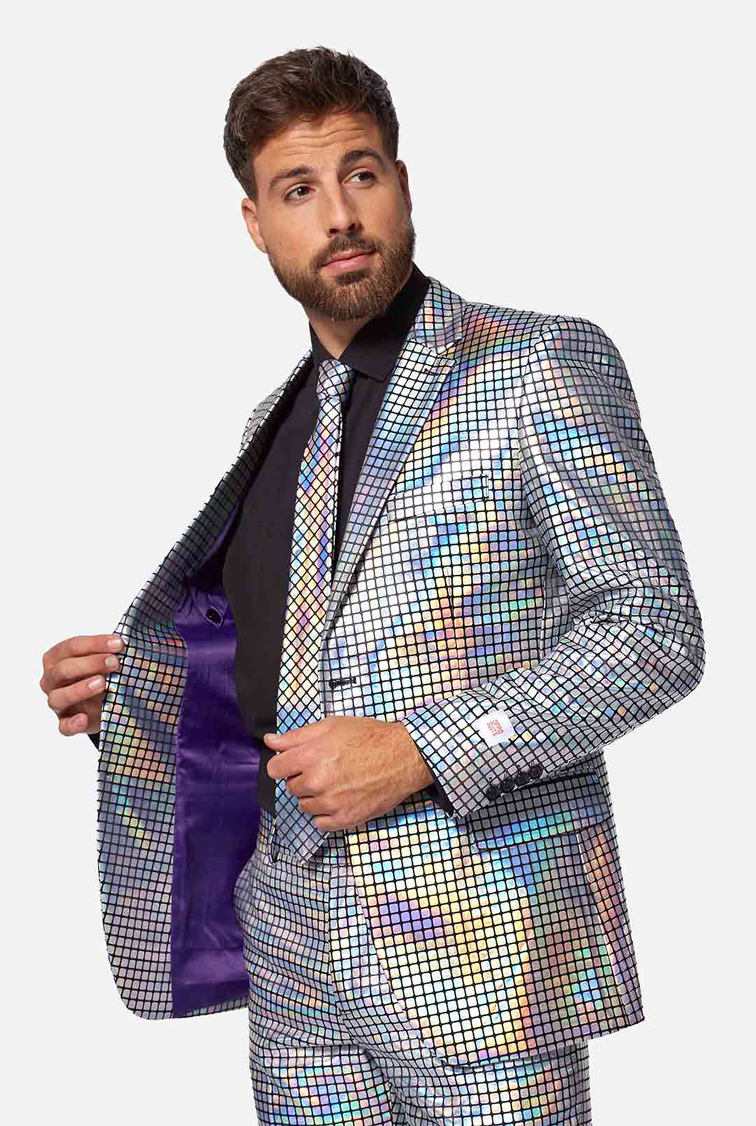 Burn baby burn… Disco inferno! This dazzling mirror patches suit is an absolute crowd favorite. Do you have the moves and the groove to wear it with respect to the sound of disco? Then wear it to your next festive occasion, and everyone will keep dancing around you all night long.